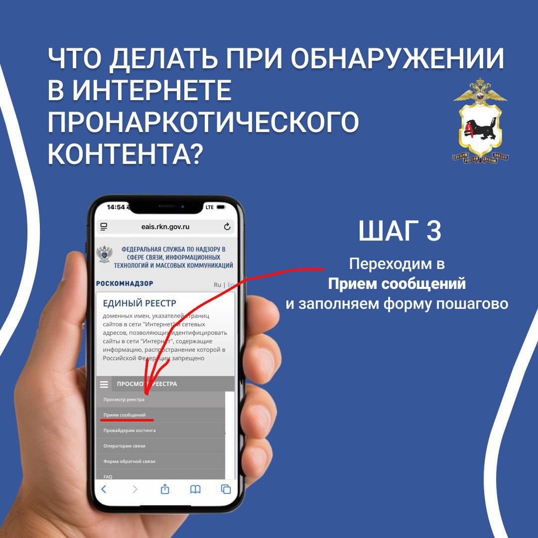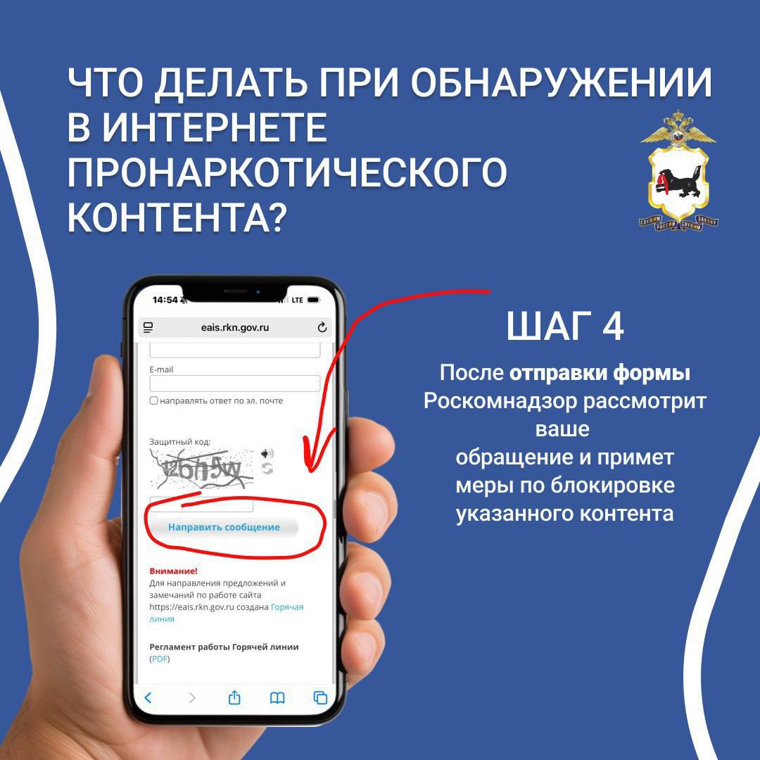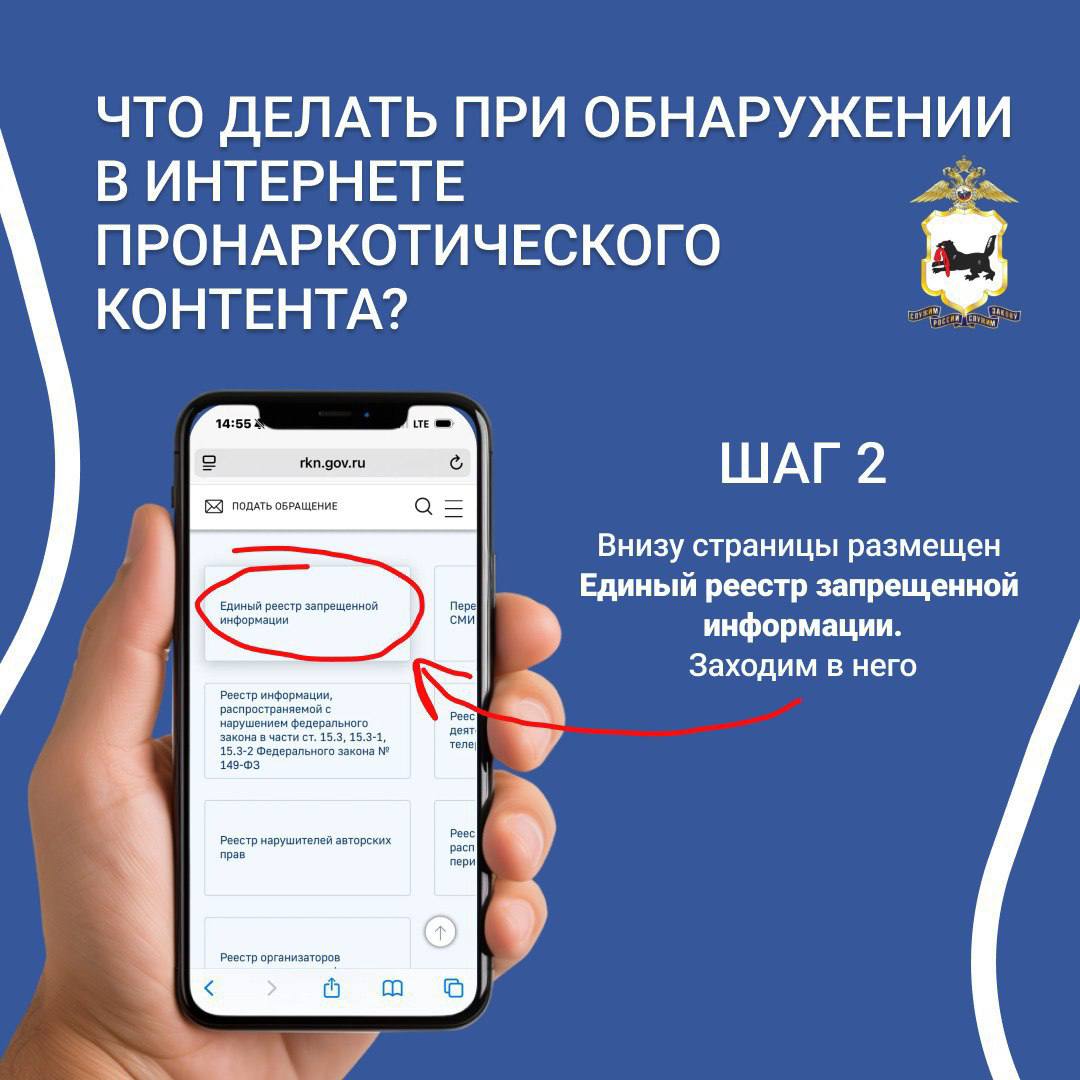 МВД России призывает не оставаться в стороне, присоединиться к акции «Сообщи, где торгуют смертью» и внести свой вклад в противодействие наркопреступности. Если вы стали свидетелями фактов незаконного распространения наркотиков, не пытайтесь самостоятельно их пресекать. Следует сообщить о них в полицию по телефону «102» или по «телефонам доверия», номера которых можно уточнить на официальных сайтах территориальных органов внутренних дел или интернет-порталах органов исполнительной власти субъектов Российской Федерации.