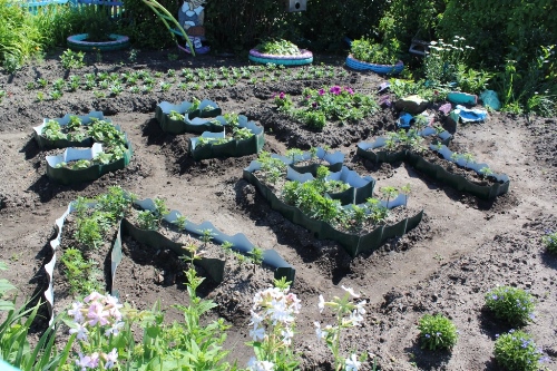 По обе стороны от дорожки в школу два участка, которые поражают своей ухоженностью. Маргарита Александровна рассказывает, как по весне вышли всем коллективом на участок и решили подойти к его оформлению творчески. На правой половине с помощью металлопрофиля выложили клумбы в виде цифр и букв: «95 лет» и посеяли цветы. Уже грунтуется надпись «Району – 95 лет», а вскоре от взошедших вьюнков протянут шпагат в виде цветной юбки, оформят фигуру девушки с кувшином в руках, полным золотых колосьев – наш хлеборобный край. Официально юбилей района уже отмечен, но ведь весь год юбилейный и жители Приозёрного должны знать эту дату. Левая половина участка станет картиной: белый жасмин и такие же петунии будут белыми облаками, а яркий портулак разойдётся из-под них солнечными лучами. Всю эту красоту три педагога и техничка создают собственными руками, начиная от посадки рассады в собственных тепличках.