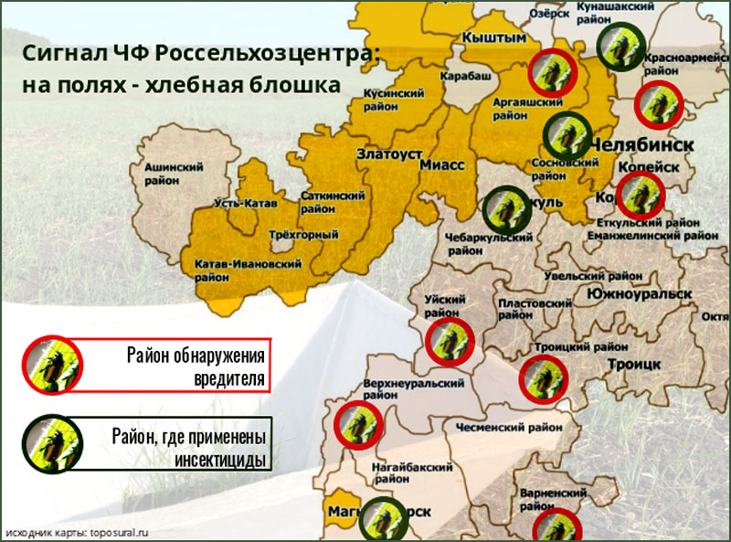 На сегодняшний день обработка инсектицидами посевов озимых и яровых зерновых против блошки проведена в Агаповском, Кунашакском, Сосновском и Чебаркульском районах на площади более 3 тысяч га.