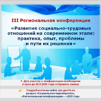 Для участия в конференции необходимо в срок до 25 ноября 2021 года отправить заявку на электронный адрес kiseleva_NA@szn74.ru.