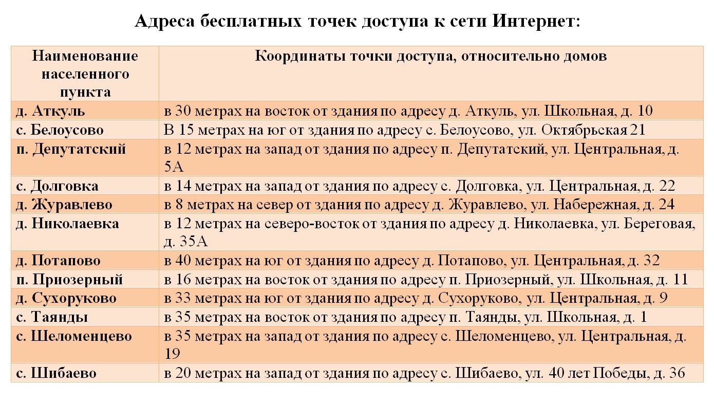 Такие точки есть и в малых населенных пунктах Еткульского района, они расположены: в Аткуле, Белоусово, Депутатском, Долговке, Журавлево, Николаевке, Потапово, Приозерном, Сухоруково, Таяндах, Шеломенцево и Шибаево.