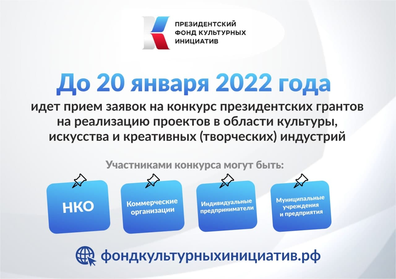 Заявки на новый грантовый конкурс 2022 года на поддержку проектов в области культуры, искусства и креативных (творческих) индустрий принимаются до 20 января. К участию приглашаются негосударственные НКО, коммерческие и муниципальные организации, а также индивидуальные предприниматели, сообщают организаторы. Подать документы можно через информационную систему фондкультурныхинициатив.рф.