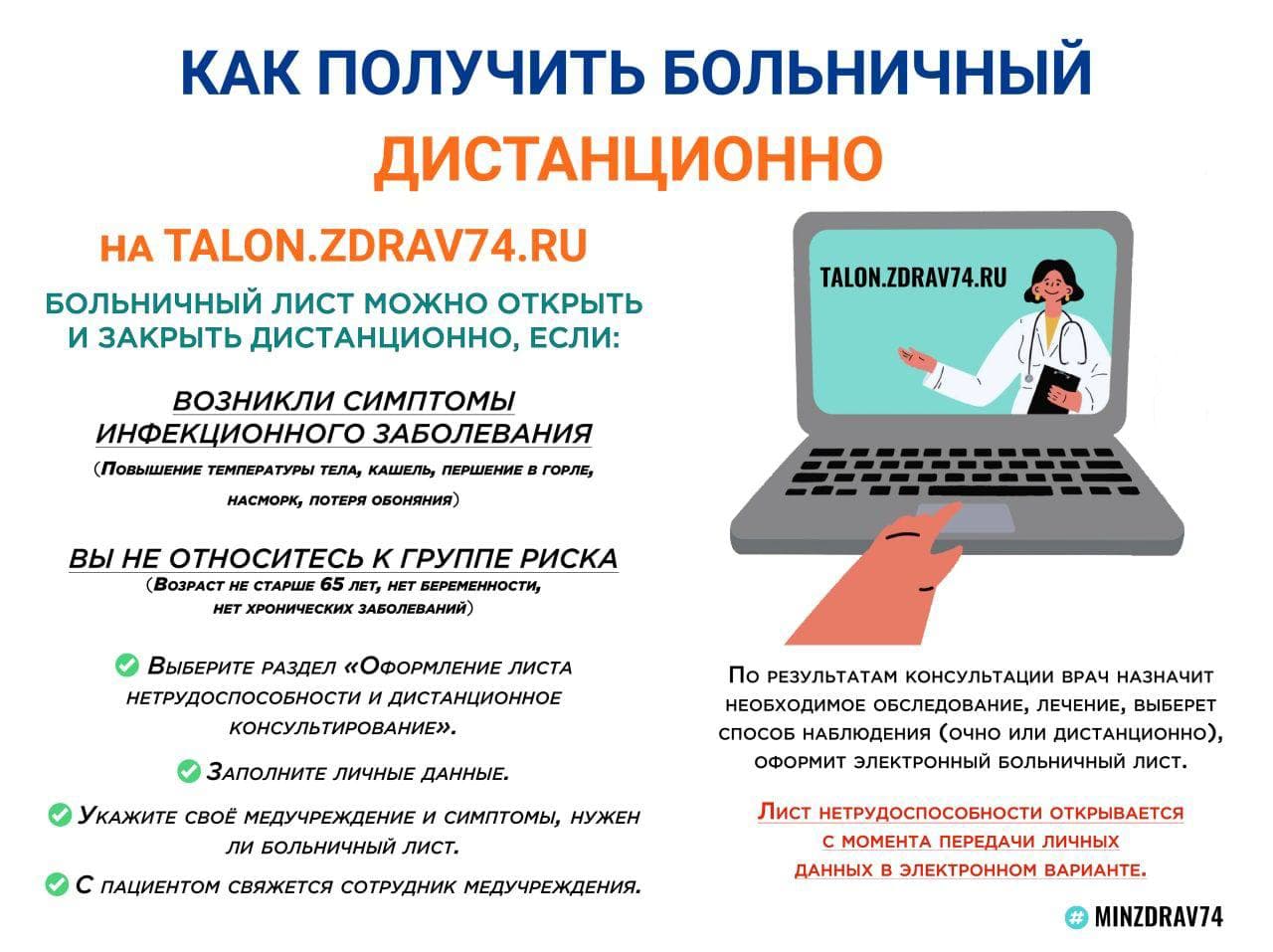 На сайте больницы или поликлиники можно найти информацию об оформлении заявки на дистанционный больничный. Или можно перейти на сайт talon.zdrav74.ru.