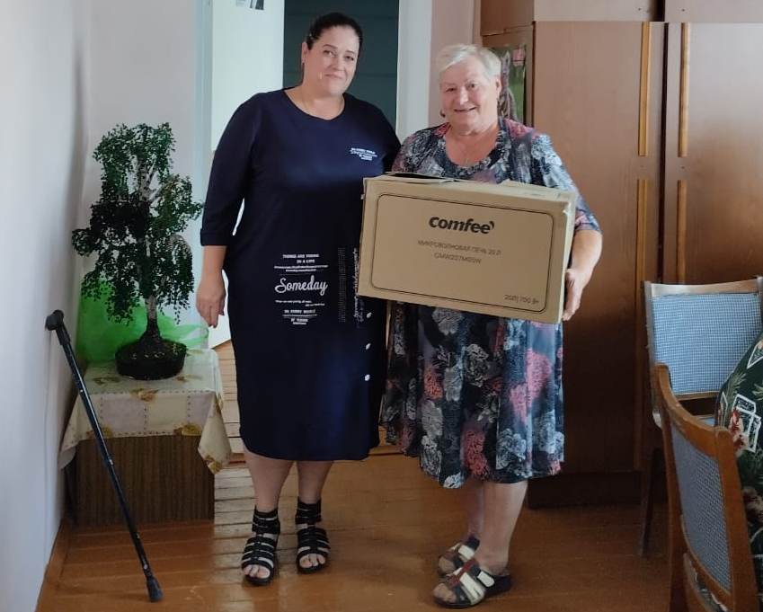 В торжественной обстановке председателю Антониде Беспоместных вручили подарок. Подарок нужный - микроволновая печь. «Вы люди с удивительной силой воли, которые, несмотря на недуг, сохраняете радость жизни, добро и красоту. Вы своим примером показываете, что, несмотря на жизненные трудности можно быть оптимистом, вести активный образ жизни и трудиться во благо окружающих», – подчеркнула Наталья Васильева. |