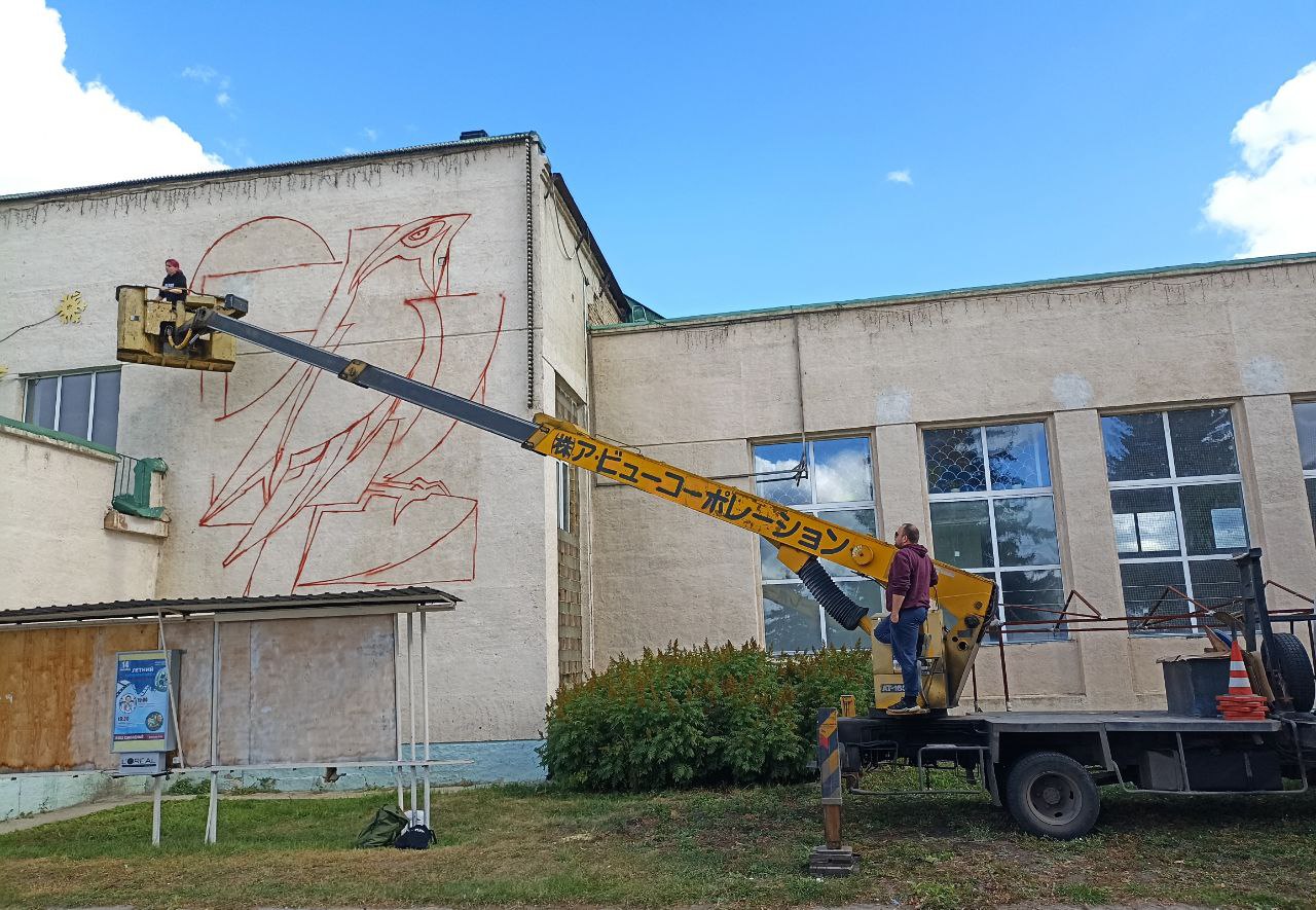 Вчера многие жители с. Еткуль наблюдали работу художников, работающих на высоте. А уже к вечеру на стене районного Дома культуры появилась яркая птица – свиристель. Именно за этот вариант проголосовала большая часть жителей района.