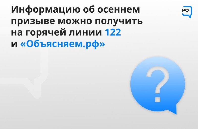 Россияне смогут получить подробную информацию о ходе проведения осеннего призыва в Вооруженные силы РФ по номеру «горячей линии» 122 и на ресурсах «Объясняем.рф». Об этом 1 ноября на совещании, посвященном вопросам информирования граждан по частичной мобилизации, сообщил заместитель председателя правительства РФ Дмитрий Чернышенко.