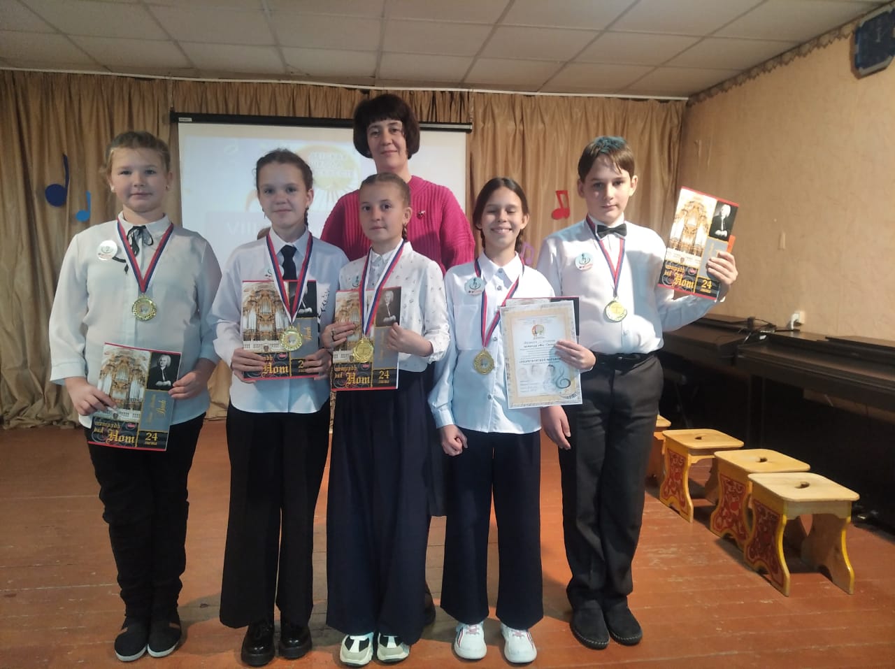 Команду ДШИ с. Коелга представляли: Манакова Альбина (капитан), Винюков Данила, Игошина Алёна, Бобылева Тася, Краснюк Настя. В конкурсе было пять этапов: 1. «Представление команды», «Разминка», «Музыкальная викторина по творчеству композиторов П. И.Чайковского, М.П.Мусоргского, Э.Грига», «Конкурс капитанов» и «Угадай мелодию». В процессе соревнования участники продемонстрировали хорошие знания по теории и слушанию музыки. Особо председатель жюри Директор МБОУДО «Еманжелинская ДШИ» Карапетян В.Г. отметил эрудированность Винюкова Данила. Победителем, лауреатом I степени стала команда «Фа- соль" ДШИ с. Коелга. Все участники награждены медалями, подарками, а преподаватель, подготовившая команду, Чувакова А.В. - благодарностью. |