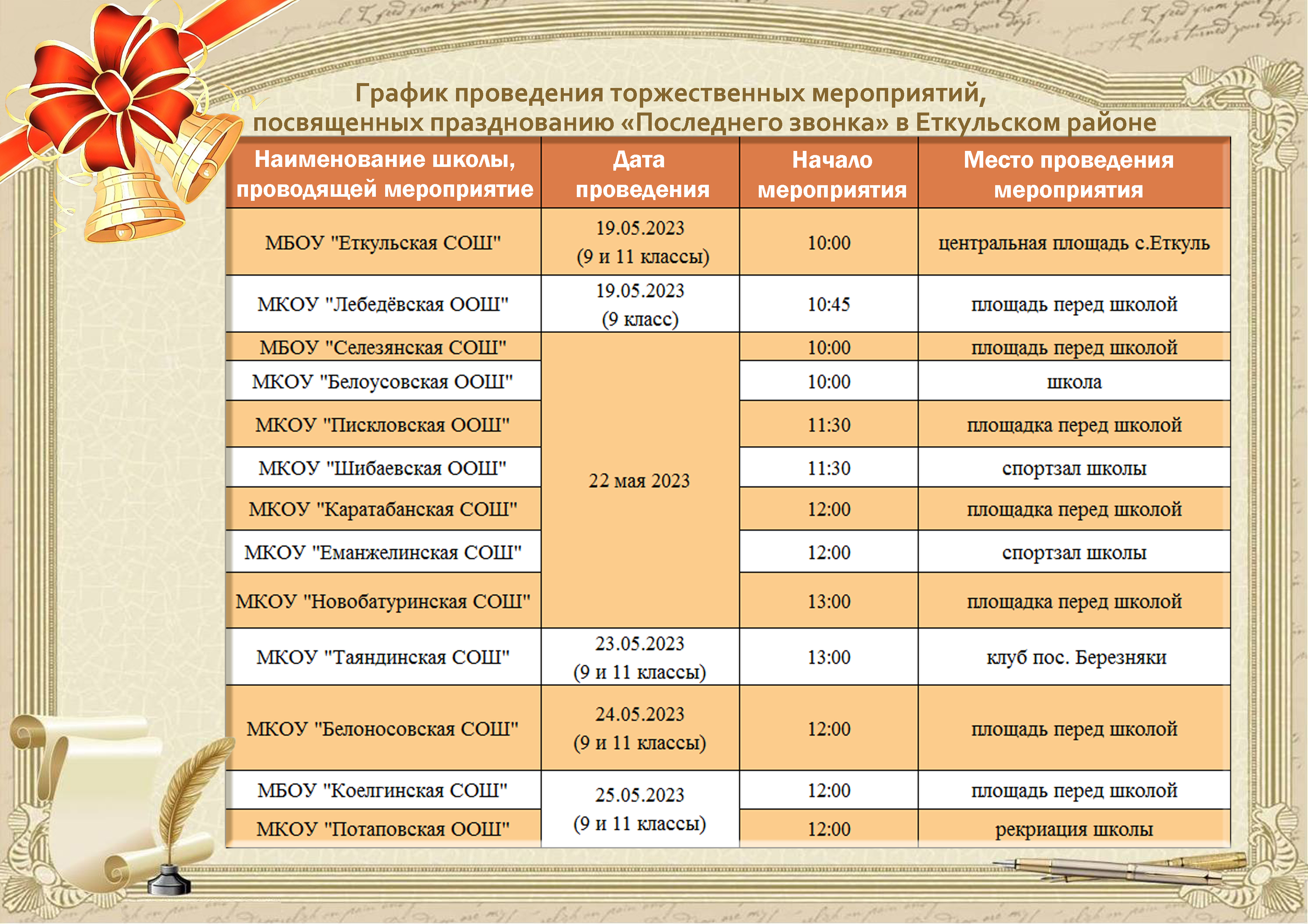 15.05.2023 График проведения торжественных мероприятий, посвящённых празднованию «Последнего звонка» в Еткульском муниципальном районе.