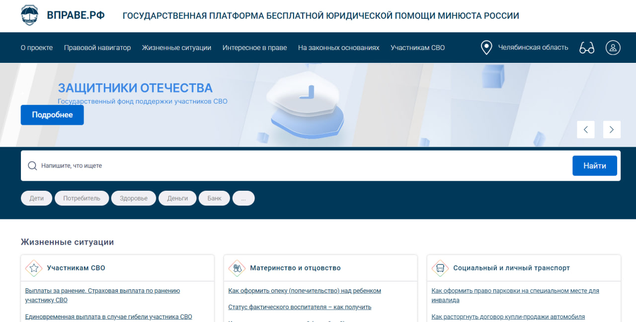 Пошаговые разъяснения по правовым вопросам Каждый раздел портала посвящён конкретным жизненным ситуациям, с которыми сталкиваются граждане. Например: — семейные отношения (развод, раздел имущества, алименты); — жилищные вопросы (приватизация, выселение, регистрация); — трудовые права (увольнение, восстановление на работе, компенсации); — получение государственных услуг (получение паспорта, оформление пенсии). В этих разделах пользователи могут найти подробные разъяснения по каждому вопросу, а также рекомендации о дальнейших действиях. На портале представлены актуальные версии федеральных законов, указов Президента и постановлений Правительства РФ. Информация о государственных органах и их компетенции Для удобства граждан портал содержит информацию о структуре и полномочиях государственных органов. Это помогает пользователям определить, куда именно следует обращаться для решения той или иной проблемы. Ответы на часто задаваемые вопросы Жизненные ситуации содержат готовые ответы на типовые вопросы, связанные с различными правовыми аспектами. Возможность получения бесплатной юридической помощи Через портал можно обратиться в Государственное юридическое бюро (ГЮБ) своего региона для получения профессиональной юридической консультации. Подробная информация на сайте государственной платформы ВПРАВЕ.РФ по ссылке https://вправе.рф/?ysclid=mbeua0tm2m393558357 |