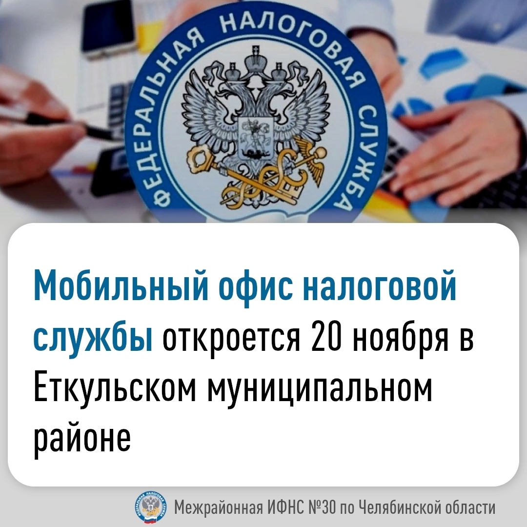 Межрайонная инспекция Федеральной налоговой службы № 30 по Челябинской области 20 ноября с 10:00 до 12:00 организует работу мобильного офиса в здании Администрации Еманжелинского сельского поселения Еткульского муниципального района по адресу: с.Еманжелинка, ул. Лесная, 2а.