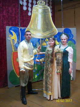 Стоят они на страже за честь родной земли. Воины христовы – Минин и Пожарский Пламенною верой Отечество спасли». Клип на эту песню А.Мысловского, используемый в программе «Расскажите нам, колокола» ярко иллюстрирует события Смутного времени. В начале XVII века Россия осталась без царя. На престол претендовали иноземцы. Московские бояре, захватившие тогда власть, предали народ и открыли ворота Москвы польскому войску. Голод, разруха, анархия истощили народ. Тогда-то по призыву патриарха Гермогена создаётся народное ополчение, во главе которого становятся нижегородский староста Козьма Минин и стольник князь Дмитрий Пожарский. Считается, что 4 ноября 1612 года польско-литовские интервенты были изгнаны из Москвы, что ознаменовало собой конец Смутного времени в истории Российского государства. Именно этот день является Днём воинской славы России и отмечается как День народного единства. В нынешнем году со времён тех событий исполняется 405 лет. Белоносовцы, затаив дыхание, внимали театрализованному действу так, что аплодисментам дали волю только на финальной песне, дабы не нарушить его во время повествования. 11-ый класс в Книге отзывов пишет: « Яркие костюмы, чудесные голоса, эмоциональное прочтение, прекрасная презентация оставят неизгладимое впечатление от увиденного». Художественные образы народного ополчения в сценической программе создают Сергей Шиховцев и старшеклассницы Еткульской средней школы Расила Галимова и Юлия Чернева ( на снимке слева направо). |