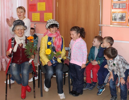 Разбившись на две команды, дети усердно наряжали в шляпки, шарфы, рукавички двух «бабушек» Татьяну и Надежду, дарили им цветы, а потом каждой прочитали по стихотворению. Бабушки и дедушки охотно сыграли в игру на скорость и оказались обладателями кто шлема, кто пушистого воротника, а кто и короны. Дети хором угадывали, героями каких сказок стали взрослые. Взрослым тоже пришлось угадывать названия сказок, герои которых появились на экране. Оказалось, что сказки знают все – и взрослые, и дети!
