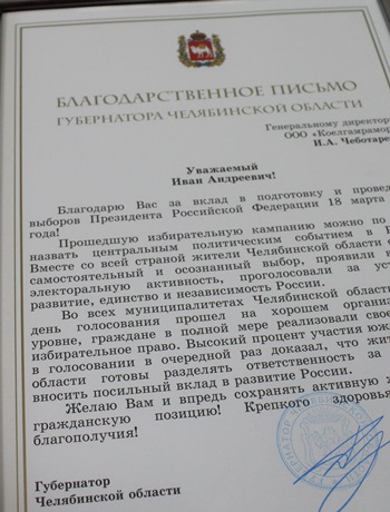Благодарственное письмо губернатора Челябинской области Бориса Дубровского вручено генеральному директору АО «Коелгамрамор» Ивану Чеботарёву, одному из пяти активных участников президентской избирательной кампании из Еткульского района.