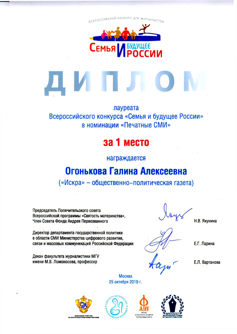 Победителем Всероссийского журналистского конкурса «Семья и будущее России» в номинации «Печатные СМИ» стала журналист АНО «Редакция газеты «Искра» Галина Огонькова.