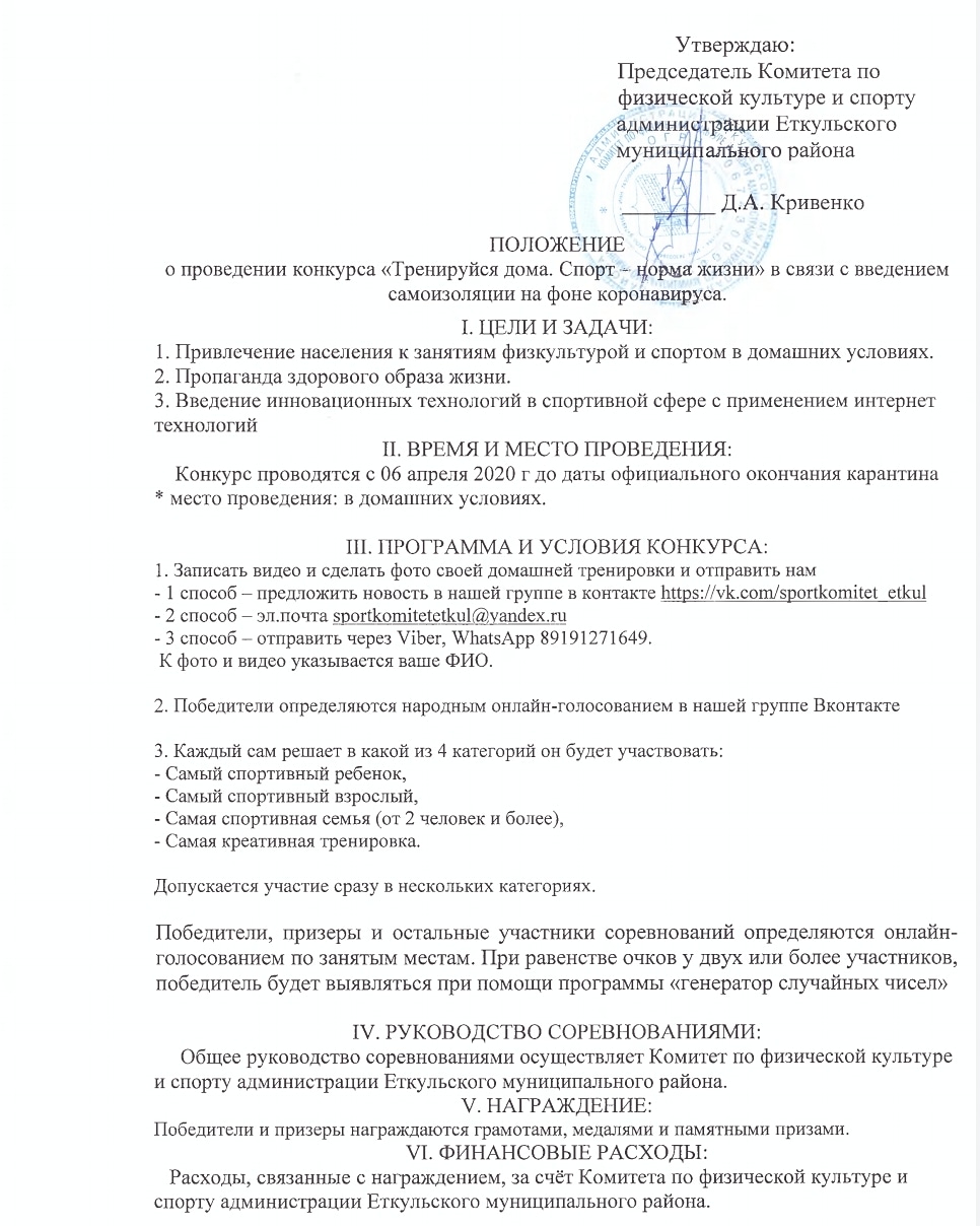 Пандемия коронавируса затронула все сферы нашей жизни: физическая культура и спорт не стали исключением. Из–за введенных в стране ограничений люди вынуждены находиться дома, не имея возможности заниматься спортом в привычном для себя режиме, а дети тренироваться в спортивных школах и секциях. Комитет по физической культуре и спорту Еткульского района приглашает всех желающих принять участи в конкурсе «Тренируйся дома. Спорт – норма жизни», целью которого является привлечение населения к занятиям спортом в домашних условиях в режиме самоизоляции. Срок проведения конкурса с 6 апреля до даты окончания официального карантина в Челябинской области, а так же в нашем районе. Обязательным условием является выполнение спортивных упражнений в домашних условиях. Чтобы принять участие в акции необходимо: 1. Записать видео или сделать фото своей домашней тренировки, результат отправить необходимо: