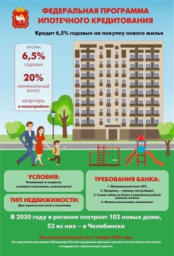 Особых требований к заемщикам нет, кроме того, что они должны быть совершеннолетними гражданами РФ. Возраст, семейное положение и наличие детей роли не играют. Жителям региона, желающим оформить ипотеку под 6,5% годовых стоит поторопиться: программа будет действовать до 1 ноября 2020 года. Ставка 6,5% годовых сохраняется на весь срок кредита. Накануне Президент РФ Владимир Путин предложил расширить условия льготной ипотеки. Южноуральские семьи смогут оформить льготную ипотеку на покупку жилья стоимостью до 6 миллионов рублей. Сейчас максимальная цена покупки жилья по ипотеке 6,5% в Челябинской области – 3 миллиона рублей. А банки уже снижают размер первоначального взноса с 20% до 15%. Важно, что льготная ипотека действует только на покупку квартир в новостройках и только напрямую у застройщика (юридического лица). Выбор у желающих купить квартиру в новостройке будет: в регионе в 2020 году планируют построить 102 новых дома, 52 из них – в Челябинске. Источник: Пресс-служба правительства Челябинской области |