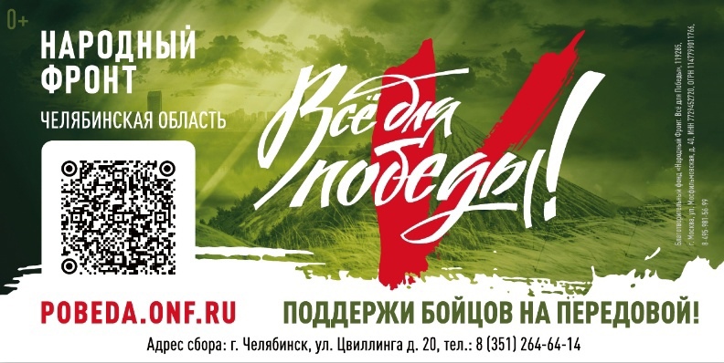 В Челябинской области создан уникальный QR-код для поддержки наших южноуральских бойцов. Отсканировав QR-код, вы сможете присоединиться к проекту Народного фронта «Все для Победы!». Все перечисленные средства пойдут на закупку необходимой военной амуниции, квадрокоптеров, теплых вещей, медикаментов и других потребностей южноуральских бойцов. Вместе мы - сила! Всё для Победы! Подробная информация о проекте – на портале pobeda.onf.ru. Телефон: 8 (351) 264-64-14 Мы находимся по адресу: г. Челябинск, ул. Цвиллинга, д. 20 |