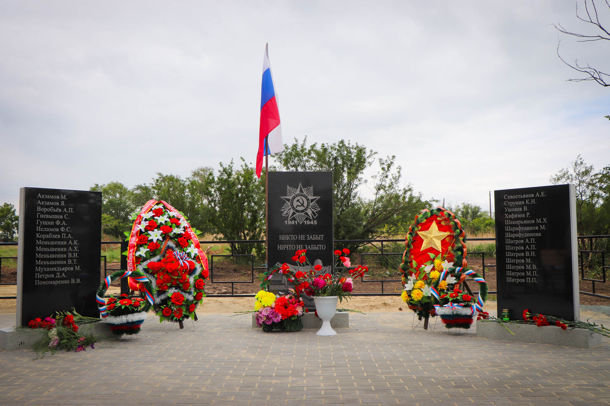 Помимо обновления мемориальных плит, также благоустроена территория вокруг: уложена брусчатка, установлены скамейки и ограждение.