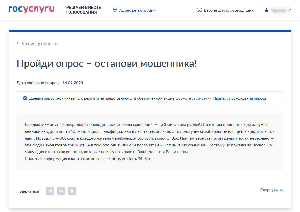 Чтобы жители сохраняли бдительность и не дали себя обмануть, Центр общественного мониторинга проводит опрос населения. Ответив на вопросы, вы узнаете больше о мошенниках и сможете их остановить.
