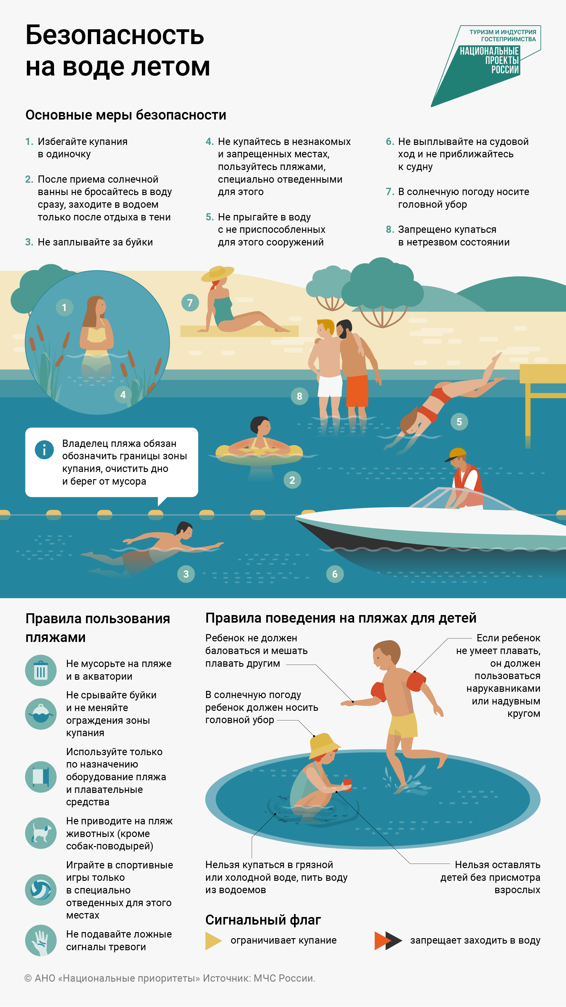 Требования, предъявляемые к обеспечению безопасности людей на пляжах и в других местах массового отдыха на водных объектах, устанавливаются действующим санитарным законодательством. В соответствии ст. 18 Федерального закона от 30.03.1999 № 52-ФЗ «О санитарно-эпидемиологическом благополучии населения» водные объекты, используемые в рекреационных целях, в том числе водные объекты, расположенные в границах городских и сельских населенных пунктов (далее - водные объекты), не должны являться источниками биологических, химических и физических факторов вредного воздействия на человека (далее - Федеральный закон от 30. 03.1999 № 52-ФЗ). На летний период Роспотребнадзор организует мониторинг за состоянием водных объектов и прилегающей территорией, о результатах которого сообщается посредством СМИ и Интернета. При выборе мест отдыха у водоема следует обращать внимание на территории, отводимые под пляжи и для массового отдыха у воды. Они должны отвечать следующим требованиям: · наличие информации о владельце пляжа и обслуживающей организации; · территория пляжа должна быть ограждена, хорошо спланирована, иметь сток дождевых вод. Территория может быть разделена на отдельные участки, для мужчин, женщин и общий. Спуск на пляж и в купальню должен быть пологим. · в местах, не отвечающих требованиям безопасности, санитарно-эпидемиологическим требованиям, устанавливаются предупредительные аншлаги «Купание запрещено»; · территория пляжа должна быть оборудована мусоросборниками, скамейками, теневыми навесами, кабинками для переодевания, душевыми установками, вывешенными графиками уборки. Должны быть организованы спасательный и медицинский пункты; рядом с пляжем должны быть общественные туалеты; · береговая территория у мест купания и в непосредственной близости к нему должна отвечать санитарно-эпидемиологическим требованиям, не должна быть загрязнена и заболочена; · в местах, отведенных для купания, и выше их по течению до 500 м запрещается стирка белья и купания животных. Места, специально отведенные для купания животных, должны быть обозначены знаками с указанием границ акватории вдоль берега; · места, отведенные для купания, должны быть обозначены знаками с указанием границ акватории вдоль берега; · в местах резкого перепада глубин, в 5-10 м от уреза воды, должен быть выставлен знак оповещения; · продажа спиртных напитков в местах массового отдыха у воды максимально ограничивается или запрещается; · в местах массового отдыха у воды не допускается купание лиц, имеющих кожные заболевания, находящихся в нетрезвом состоянии, а также купание без трусов или купальных костюмов; · на пляжах и в местах массового отдыха у воды должны быть оборудованные помещения для оказания первой медицинской помощи, и организовано постоянное дежурство медперсонала. Пункт первой медицинской помощи должен быть обеспечен необходимым инструментом и медикаментами для оказания помощи терпящим бедствие на воде, получившим травматические повреждения или пищевые отравления. Что ещё необходимо знать, выходя на организованный пляж? · для предотвращения перегревания и теплового удара, собираясь на пляж, обязательно нужно взять с собой головной убор, питьевую воду, полотенце, зонтик; · загорать лучше под зонтиком в утренние и послеобеденные часы; · перед выходом на м