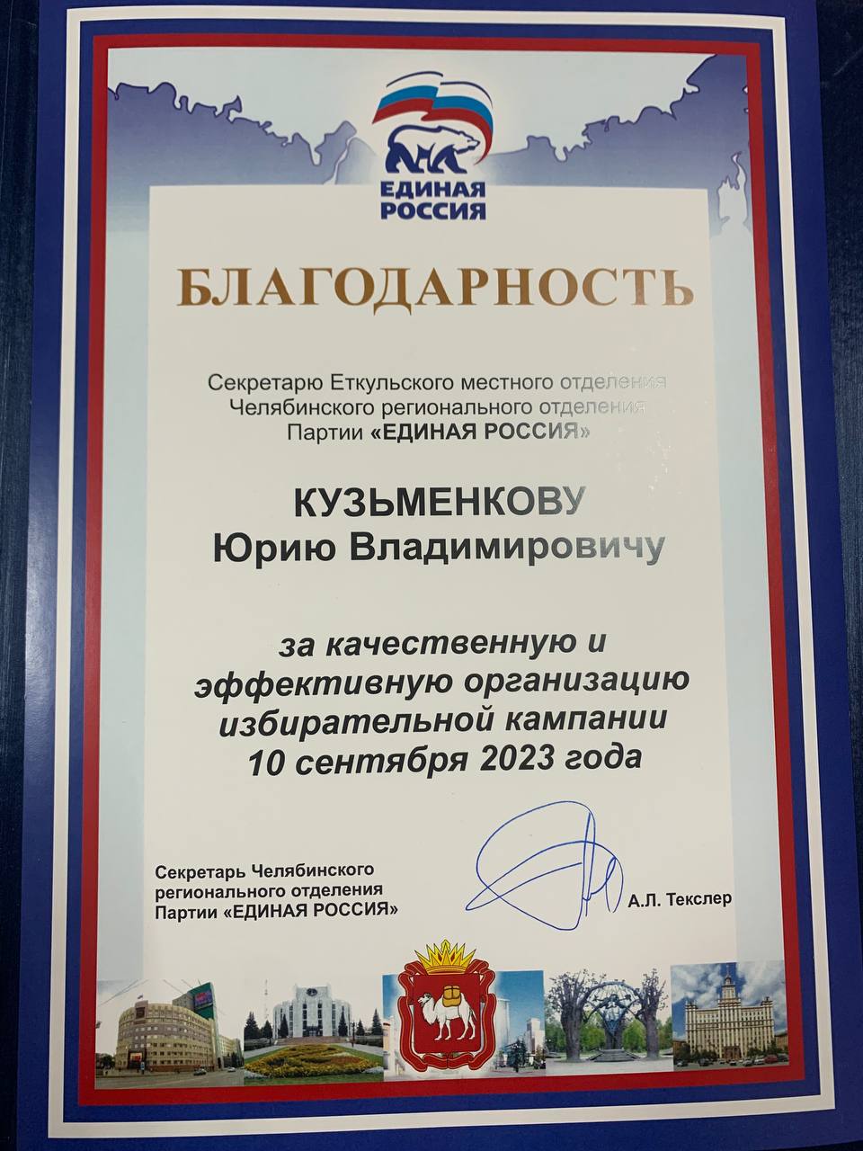 От Секретаря Челябинского регионального отделения Партии «Единая Россия» Алексея Текслера Секретарю Еткульского местного отделения Челябинского регионального отделения Партии «Единая Россия», главе Еткульского муниципального района Юрию Кузьменкову вручена благодарность за качественную и эффективную организацию избирательной кампании 10 сентября 2023 года. В ходе данных выборов
