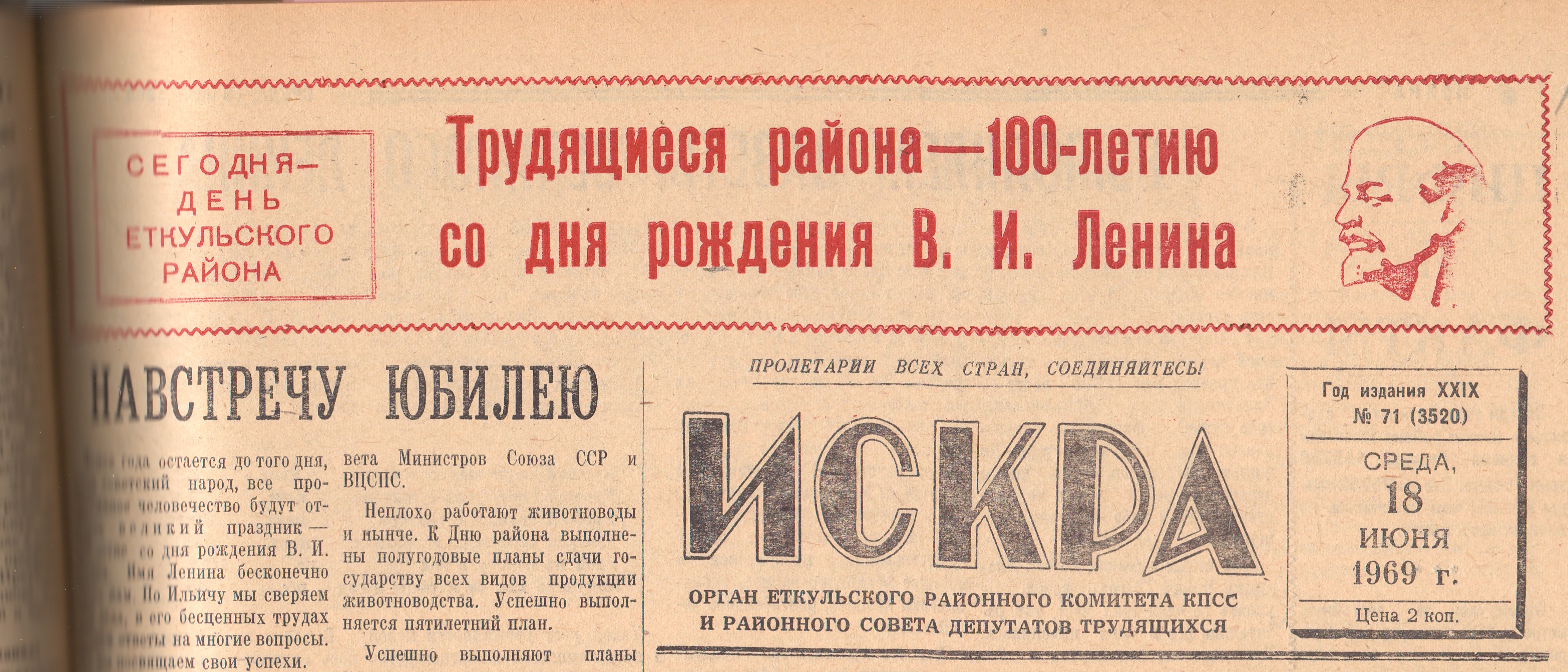 В 1969 году, когда Еткульскому району исполнялось 45 лет, наша страна готовилась к великому юбилею, 100-летию со дня рождения В.И. Ленина. На страницах каждого выпуска районной газеты «Искра» мелькали заголовки, статьи, заметки, посвященные празднованию этого события.