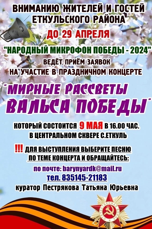 В рамках плана районных мероприятий, посвящённого празднованию Дня Победы советского народа в Великой Отечественной войне 1941-1945 годов, Еткульский районный Дом культуры ведёт подготовку социального патриотического проекта «Народный микрофон Победы - 2024».