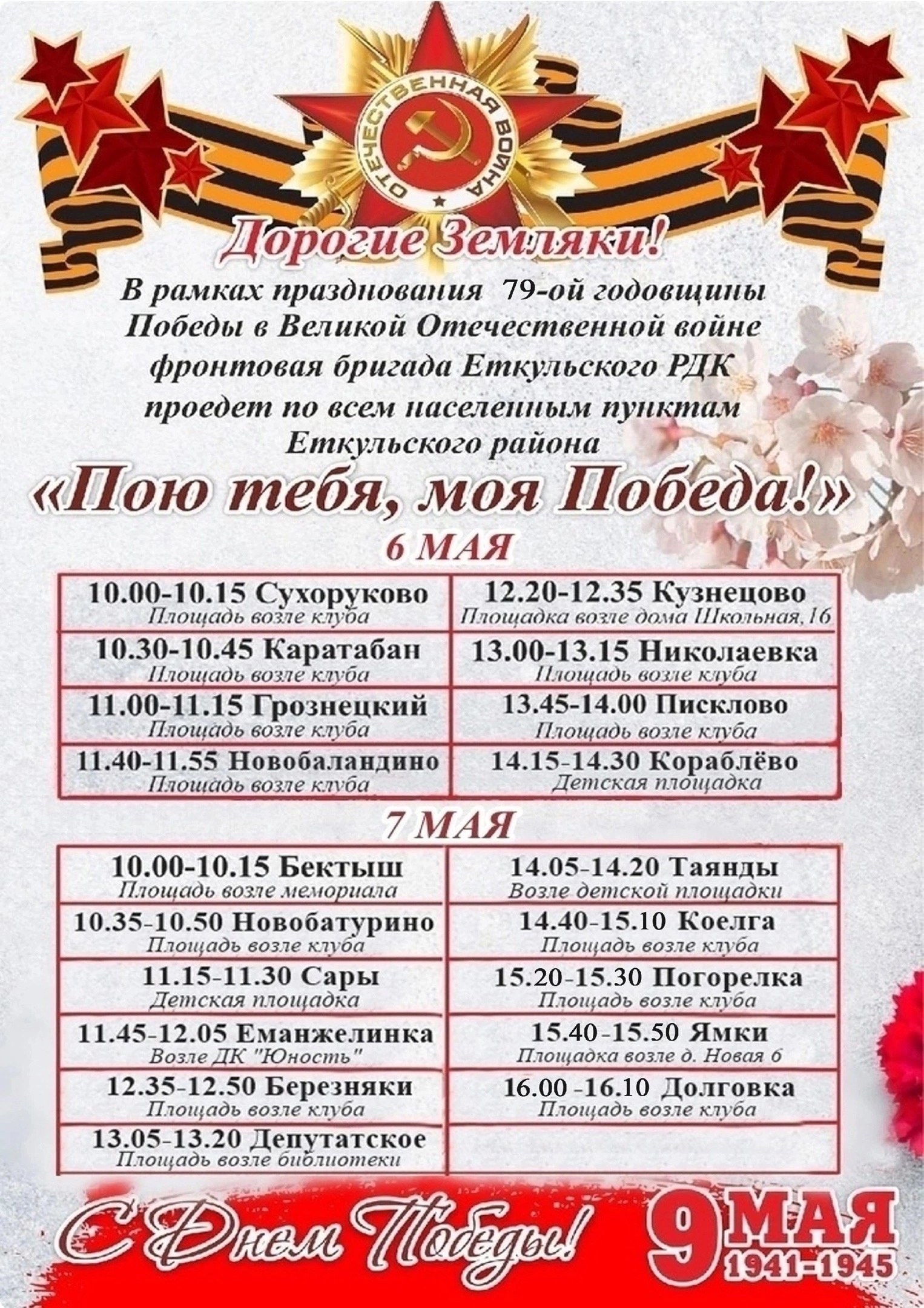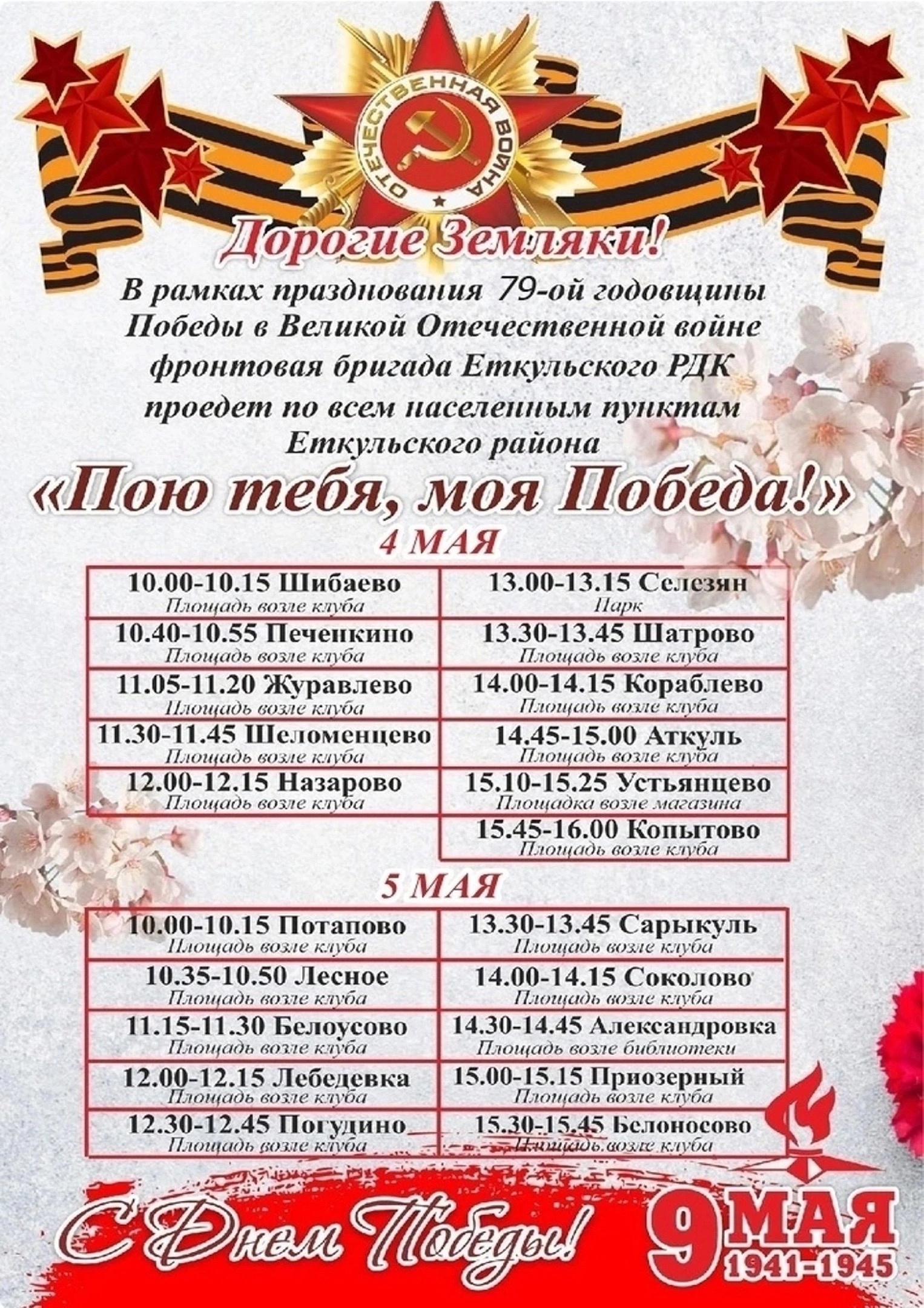 Первый день (4 мая) праздничного маршрута – Печенкинское и Селезянское сельские поселения. Второй день (5 мая) – Белоусовское, Лебедевское и Белоносовское сельские поселения. Третий день (5 мая) – Каратабанское и Пискловское сельские поселения. Четвертый день (6 мая) – Бектышское, Новобатуринское, Еманжелинское и Коелгинское сельские поселения. |