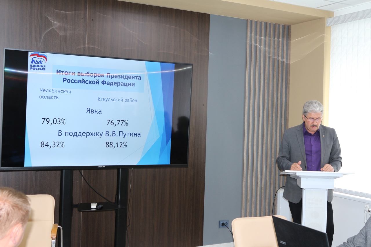 С докладом об итогах проведения избирательной кампании по выборам Президента Российской Федерации выступил глава Еткульского района, секретарь местного отделения партии Юрий Кузьменков.