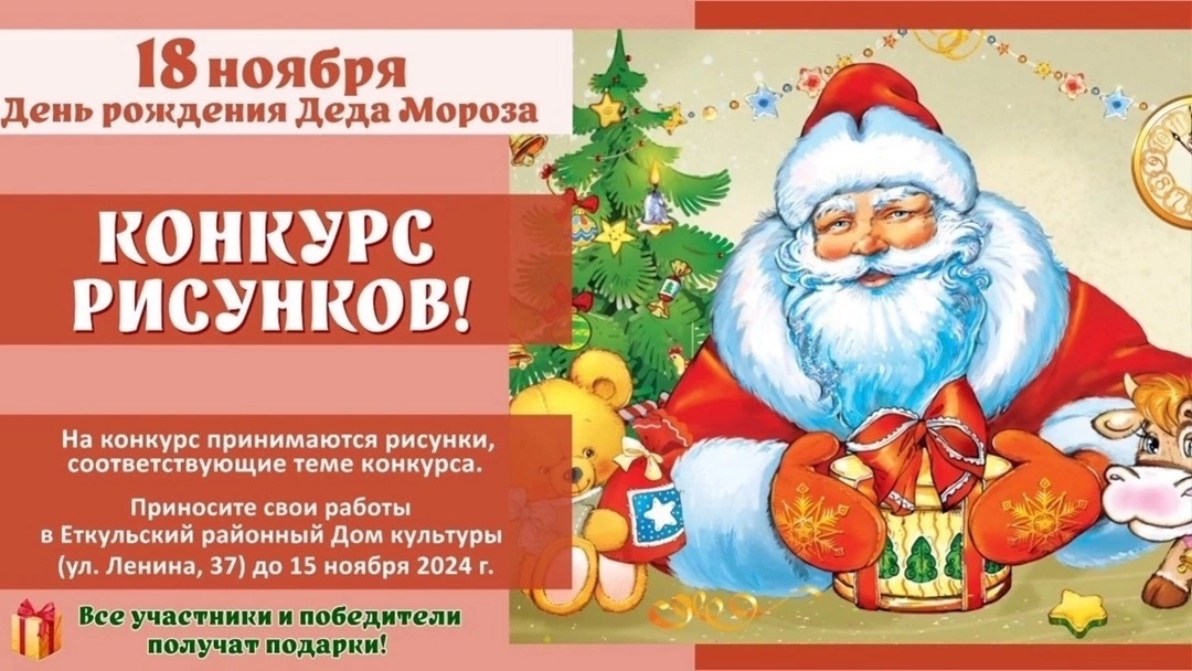 ![]() 18 ноября Российский Дед Мороз отмечает свой День рождения!![]() Районный Дом культуры приглашает ребятишек принять участие в конкурсе-выставке рисунков «С днём рождения, Дед Мороз!». Работы принимаются в РДК с.Еткуль (ул.Ленина, 37) до 15 ноября включительно. Все рисунки участников можно будет посмотреть на выставке в фойе Дома культуры с 18 ноября.Победители и участники будут награждены подарками!