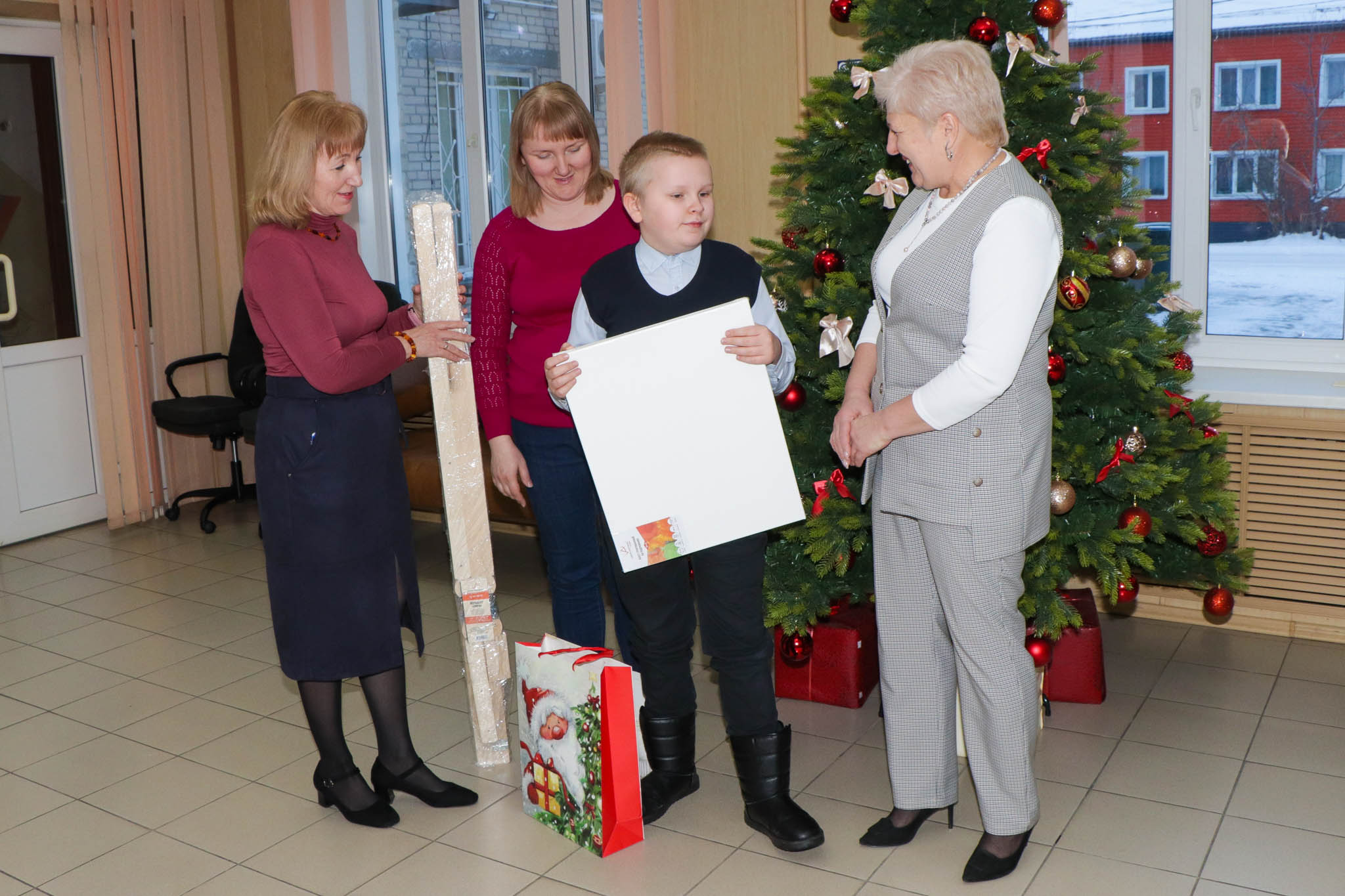 Елена Владимировна вручила заветный подарок Сергею, творческому мальчику, который увлекается созданием поделок своими руками. В качестве подарка Серёжа получил мольберт, холст и художественные принадлежности!