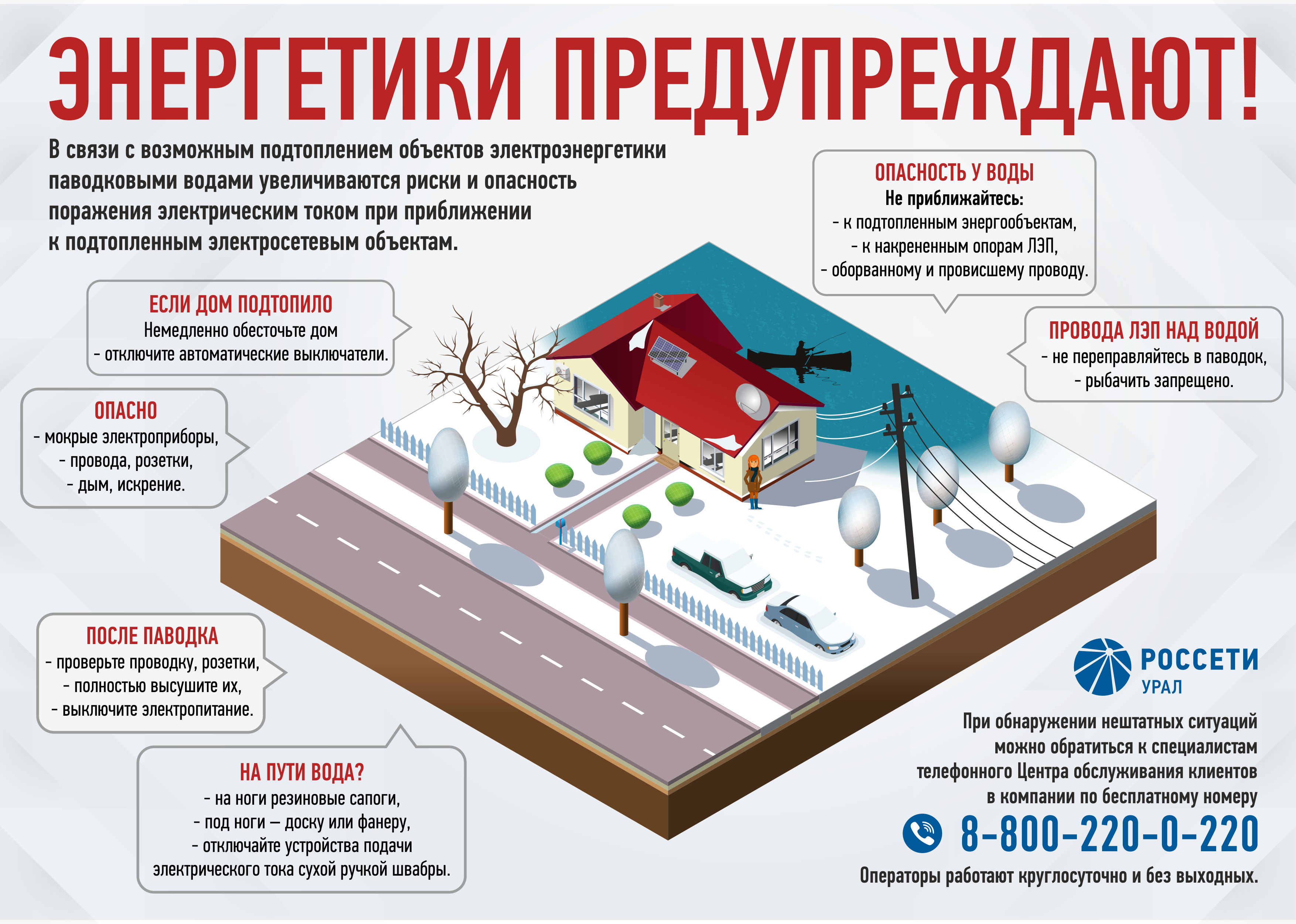 Специалисты челябинского филиала компании «Россети Урал» предупреждают: в период весеннего половодья в связи с возможным подтоплением объектов электроэнергетики паводковыми водами увеличиваются риски и опасность поражения электрическим током при приближении к подтопленным электросетевым объектам. Правила электробезопасности в период подъема воды. На что необходимо обращать внимание? · В период таяния снега с поверхностей крыш зданий и крон деревьев могут сходить снежные массы. Находясь в непосредственной близости от таких объектов, стоит быть более бдительными и осторожными и помнить, что под тяжестью снега может произойти обрыв или провисание воздушных линий электропередачи. · Если вы увидели лежащий на земле провод, знайте, что он может находиться под напряжением. Подходить к нему ближе, чем на 8 метров, смертельно опасно! Необходимо принять меры, исключающие приближение людей к месту обрыва провода. · В случае наклона опор или провисания провода может уменьшиться безопасный габарит (расстояние от электропровода до поверхности земли, построек и т.д.). Следует помнить, что поражение электрическим током может наступить не только при прикосновении, но и при приближении к проводу на недопустимое расстояние. · Жителям домов, которые расположены вблизи рек, следует обращать внимание на подъем уровня воды в водоёме и возможность подтопления здания. В случае опасности необходимо отключить подачу электроэнергии в распределительном шкафу, который находится в доме или во дворе. В чрезвычайной ситуации ответственные службы отключают электричество на всей территории подтопления. · Если ваш дом все же попал в зону затопления, перед тем, как покинуть жилье, необходимо проверить отключенное состояние вводных устройств электроэнергии (отключенные автоматы, вывернутые пробки и т.п.), отключить газ, воду и местное отопление в доме и хозяйственных постройках. Следует также помнить, что нельзя подключать и отключать электричество мокрыми руками, потому что вода хорошо проводит ток. После затопления использовать розетки можно только в случае их полного высыхания. В случае обнаружения энергообъектов, оказавшихся в зоне подтопления, следует обратиться по единому номеру 8-800-220-0-220 (звонок по России бесплатный). Для звонка с мобильных устройств можно воспользоваться коротким номером 220. Услуга доступна на сетях мобильных операторов связи МегаФон, МТС, Билайн, Т2. |