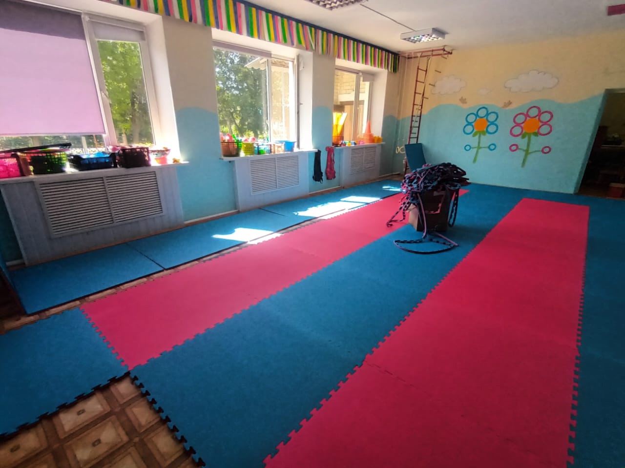 В Еманжелинском детском саду «Солнышко» также ведутся работы: обновляются игровые зоны, появляются красивые рисунки на стенах. Приобретено профессиональное спортивное покрытие для снижения рисков получения травм и ушибов – будо-маты.