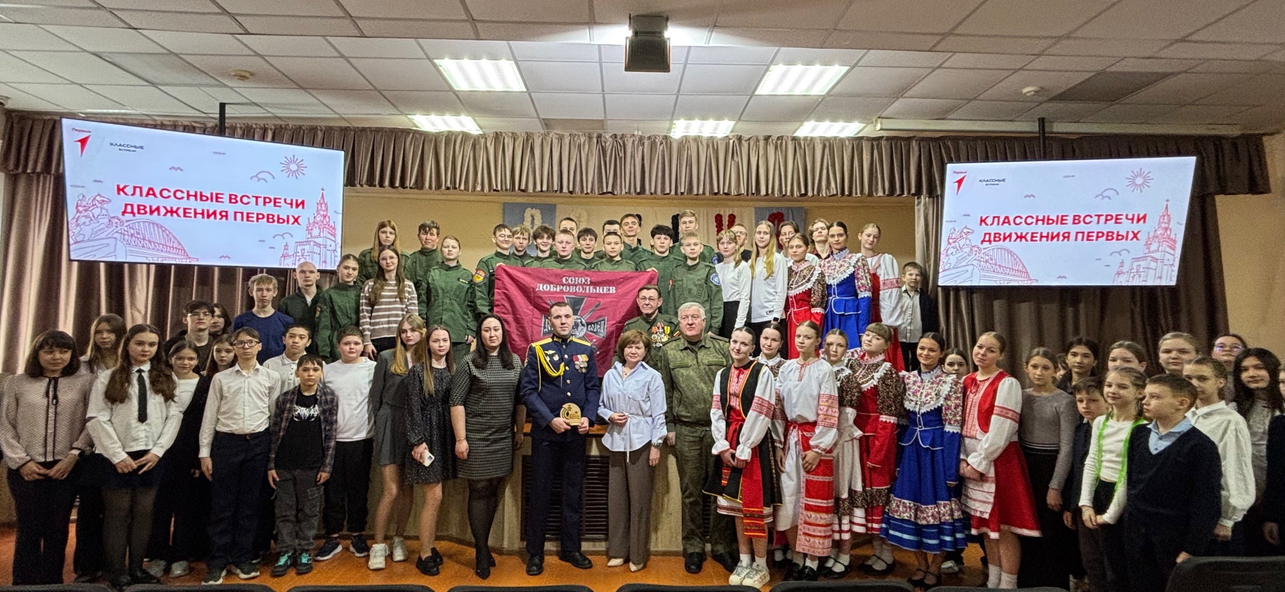 В Еткульской школе в рамках проекта «Классные встречи» Движения Первых прошла значимая встреча.Учащиеся встретились с участниками специальной военной операции и ветеранами боевых действий.