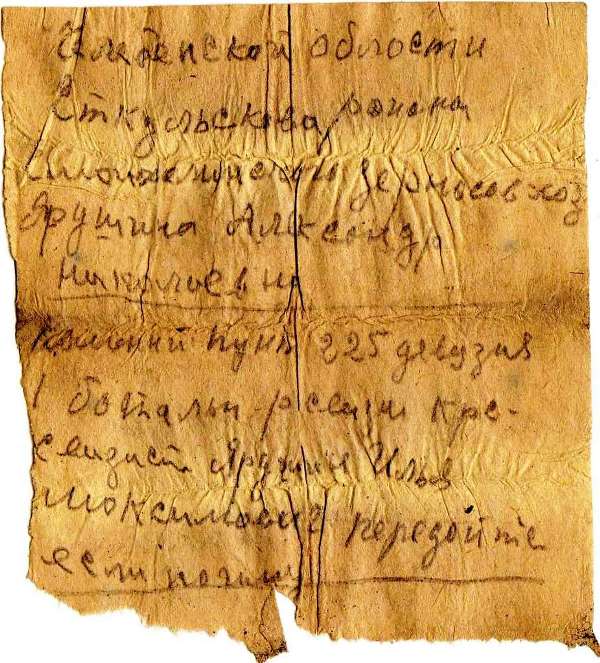 Александр пишет, что в ходе работы на территории Демянского района, Новгородской области, на месте боёв, шедших здесь в ноябре 1941 года, были найдены останки четырёх солдат Красной Армии. С одним из них был медальон, в котором сохранилась записка: «Челябинская область Еткульского района. Еманжелинский зерносовхоз Ярушина Александра Николаевна. 225 дивизия связи Ярушин Илья Максимович передайте, если погибну». На сайте «Мемориал», обобщённый банк данных которого содержит информацию о защитниках Отечества, погибших и пропавших без вести в период Великой Отечественной войны и послевоенный период, найдено два донесения на солдата, которые составлены и подписаны военкомом Еткульского района. Из донесений следует, что Илья Максимович Ярушин, 1914 года рождения, уроженец деревни Еманжелинка Еткульского района, призван указанным военкоматом 21 августа 1941 года, пропал без вести в октябре 1942 года. И сделана пометка, что извещение об этом выслано матери. Указан здесь и адрес жены: Ярушина Александра Николаевна, г. Коркино, Новое строительство, б. постройкома. В другом извещении указывается, что солдат пропал без вести в апреле 1942 года, и дан адрес матери: Ярушина Евгения Николаевна, город Коркино, посёлок Бектыш. Ребята из поискового отряда выражают надежду, что откликнутся родственники солдата, которые, возможно, до сих пор живут либо в Коркинском районе, либо в Еткульском. Фамилия солдата с такими же инициалами есть на плитах Аллеи Памяти в г. Коркино. А вот электронный запрос в областную Книгу памяти результатов не дал. Уважаемые земляки, если вам известно что-нибудь о родных и близких погибшего солдата, обращайтесь в редакцию газеты «Горняцкая правда» (г. Коркино, ул. Маслова, 1, телефон 3-89-38). Галина Павлова. P.S. С такой же просьбой журналисты общественно-политической газеты Еткульского муниципального района «Искра» обращаются к своим землякам. Если вам что-то известно об Илье Максимовиче Ярушине, о его семье, пожалуйста, сообщите в редакцию. Есть полное право надеяться, что родом солдат из наших краев, ведь не зря в записке значится Еманжелинский зерносовхоз. |