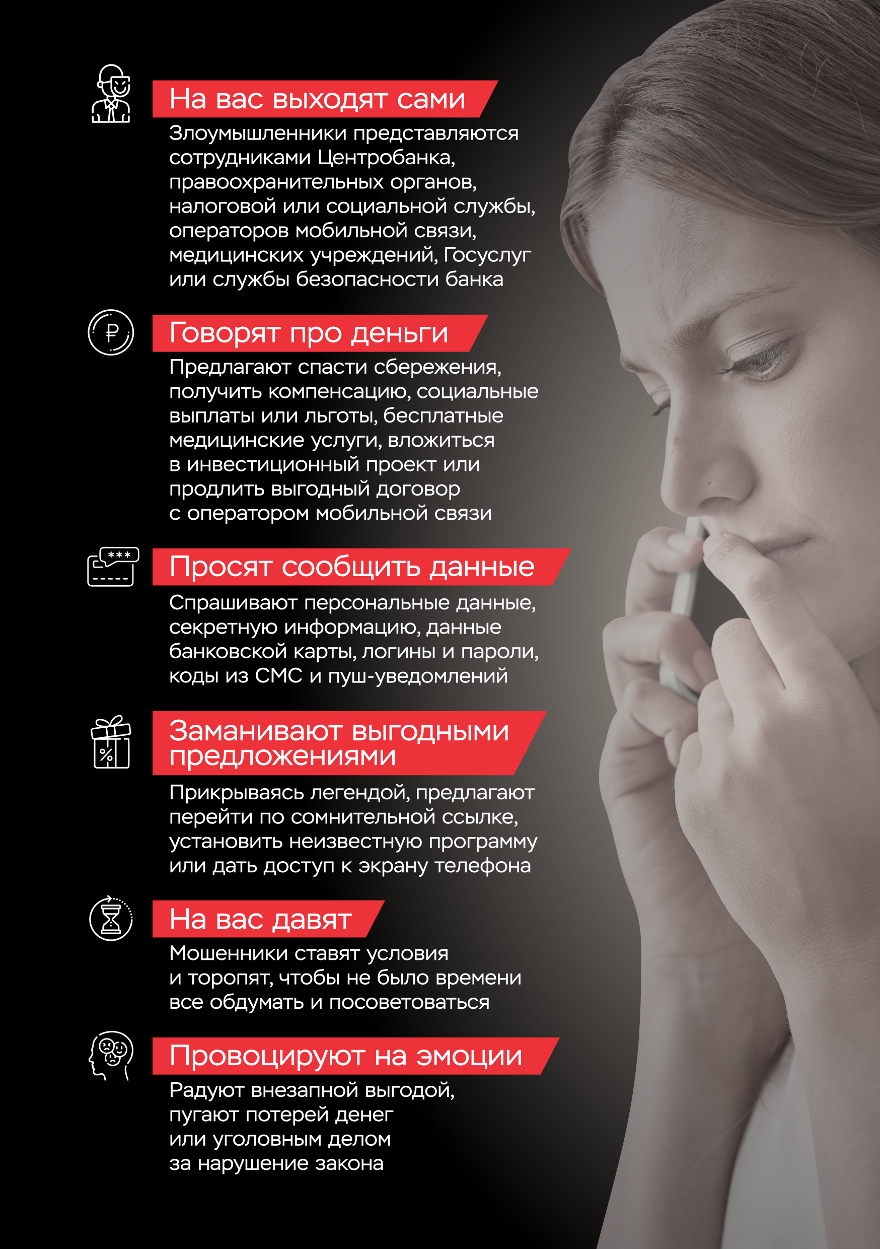 прибегают к приему сторителлинга (истории с героями и деталями); вводят различных персонажей для исполнения ролей (специалисты банковских служб, руководители, следователи и т.д.); используют эмоциональное и психологические давление.Чтобы обезопасить себя и своих близких, важно знать актуальные схемы и уловки мошеннических действий, а также уметь определять признаки, позволяющие своевременно выявить, что человек находится под воздействием злоумышленников.