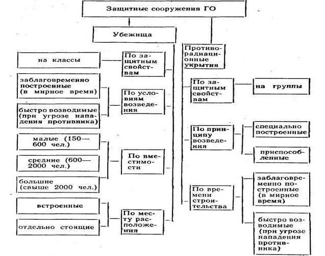 По эффективности защиты от воздействия ударной волны ядерного взрыва (защитным свойствам) убежища подразделяются на классы. Убежища различаются так же по: условиям возведения; вместимости; месту расположения.