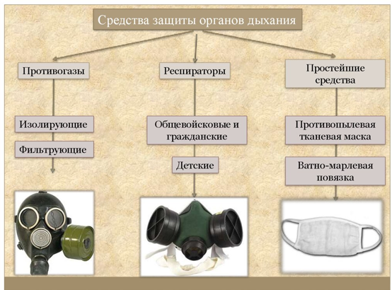 Противогаз — наиболее надежное средство защиты органов дыхания, который предназначен для защиты органов дыхания, лица, глаз, а иногда и кожи головы от вредных примесей, а также болезнетворных микробов и токсинов. Все противогазы по принципу действия подразделяются на фильтрующие и изолирующие. Человек, надевший фильтрующий противогаз, дышит предварительно очищенным воздухом, а надевший изолирующий — смесью кислорода, находящегося в баллоне, и выдыхаемого воздуха после его очистки от влаги и углекислого газа.